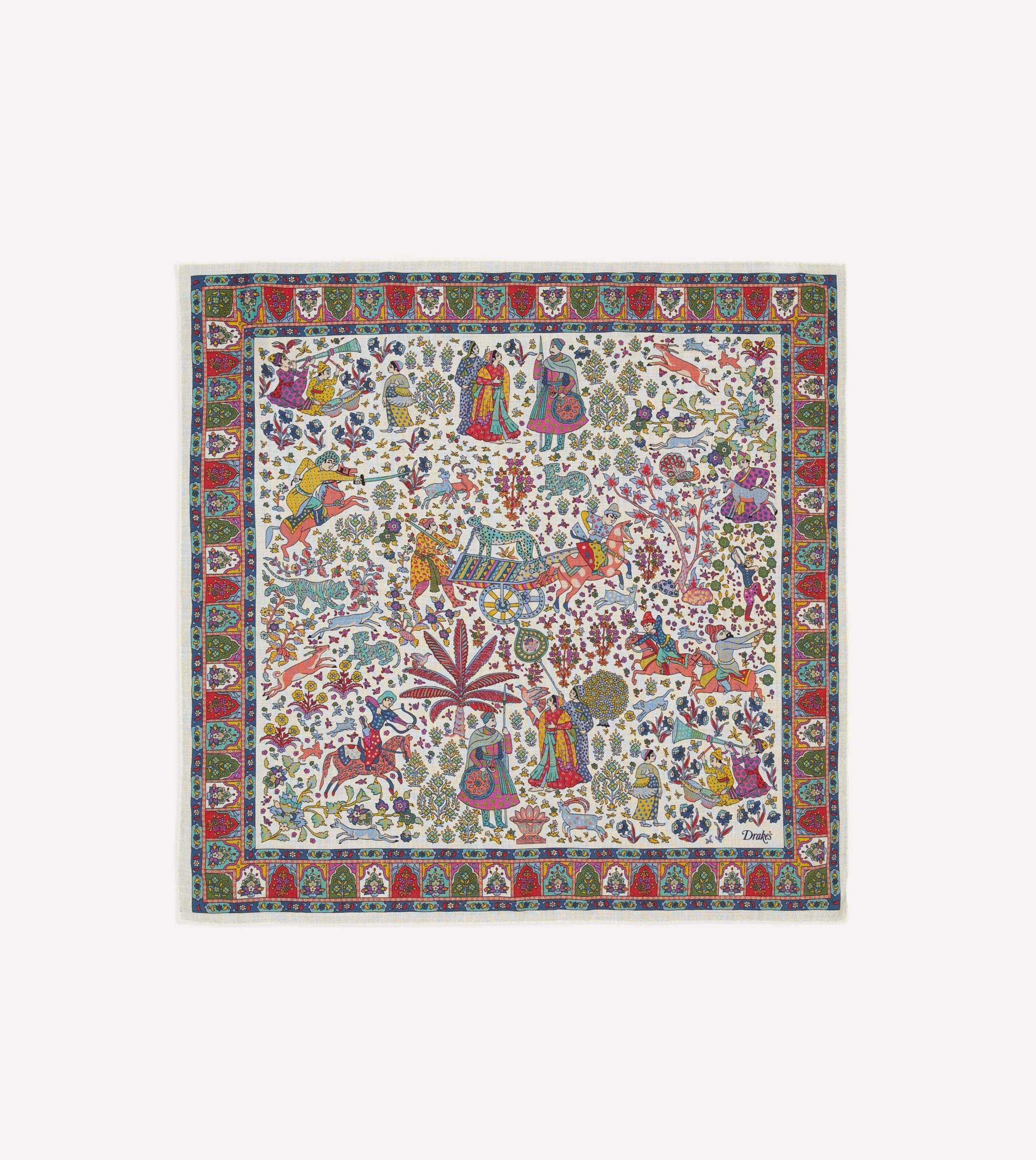 Ecru Floral Mughal Print Wool-Silk Bandana