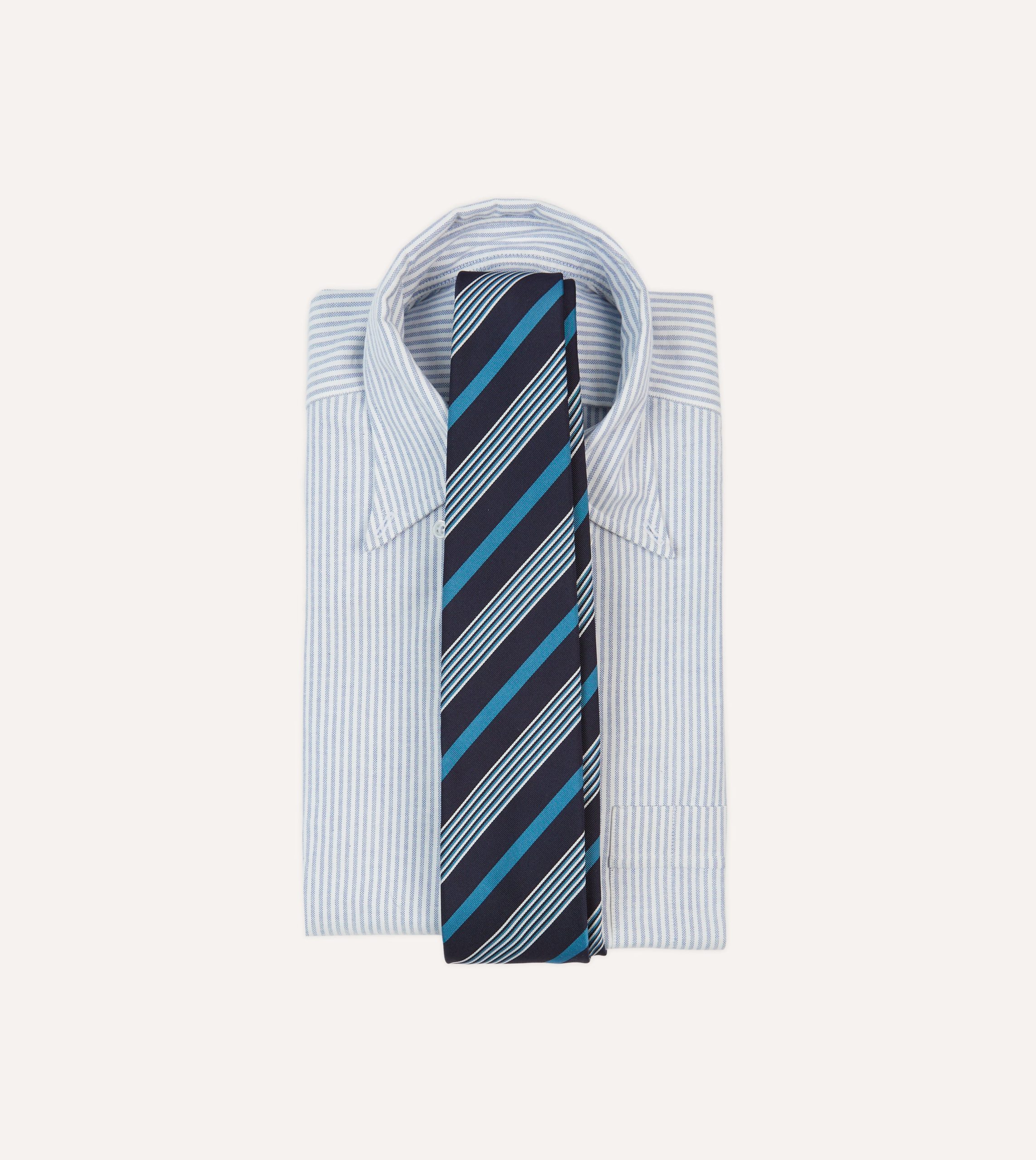 Navy. Blue and White Multi Stripe Mogador Silk Tipped Tie